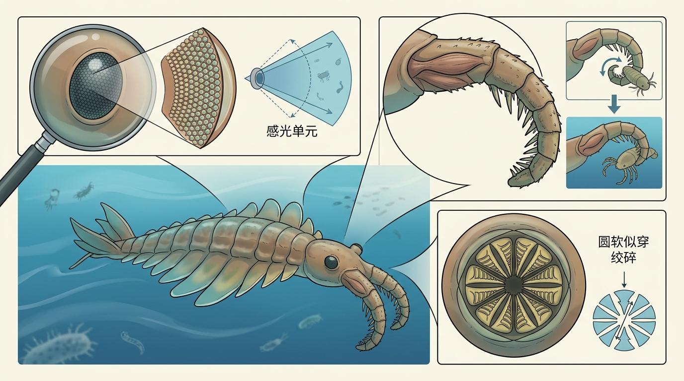 5.08亿年前的寒武纪浅海,六十厘米长的奇虾正盯着海底发呆——它是这片水域的顶级捕食者,每只眼睛带着一万六千个感光单元,能在浑浊海水中锁定十米外的动静,却连最常见的三叶虫都吃不到。